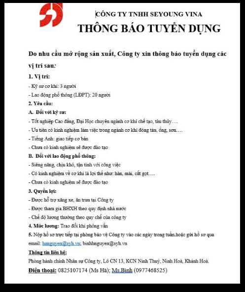 Thôgn báo tuyển dụng công ty TNHH Seyoung Vina