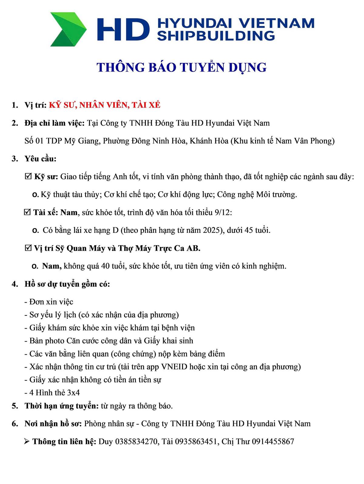 Thông báo tuyển dụng công ty đóng tàu Huyndai Việt Nam